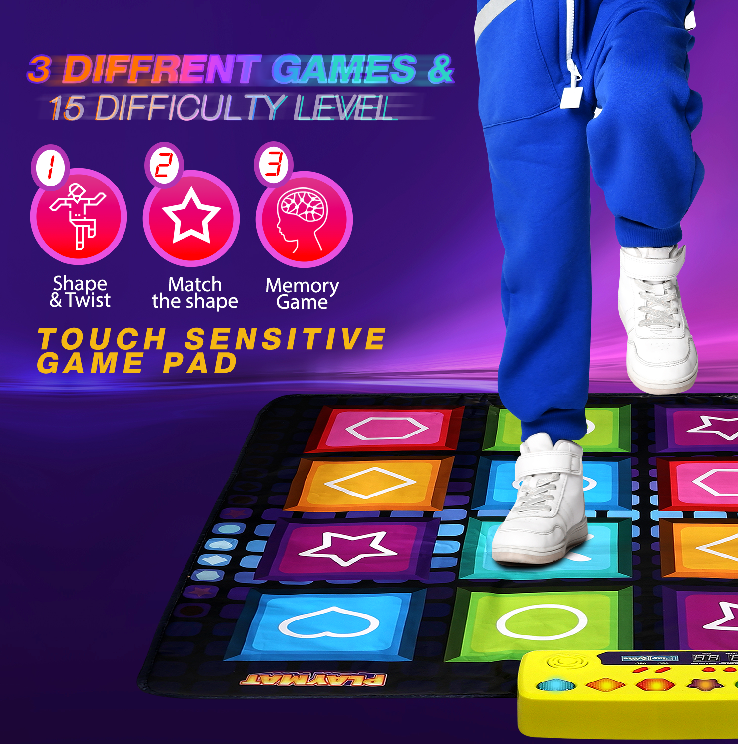 - UNIQUE DANCE MAT - Improve your kids' fitness levels, coordination, and interaction with PlayRoute's Shape and Twist Play Mat! Alone or with a friend, they will enjoy grooving to the music along with 3 exciting games (15 levels): Match The Shape, Shape & Twist, and Memory Game